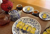 4. 긴 타원형으로 밀어 커스타드 크림을 넣고 덮어 반달을 만든 후 가장자리를